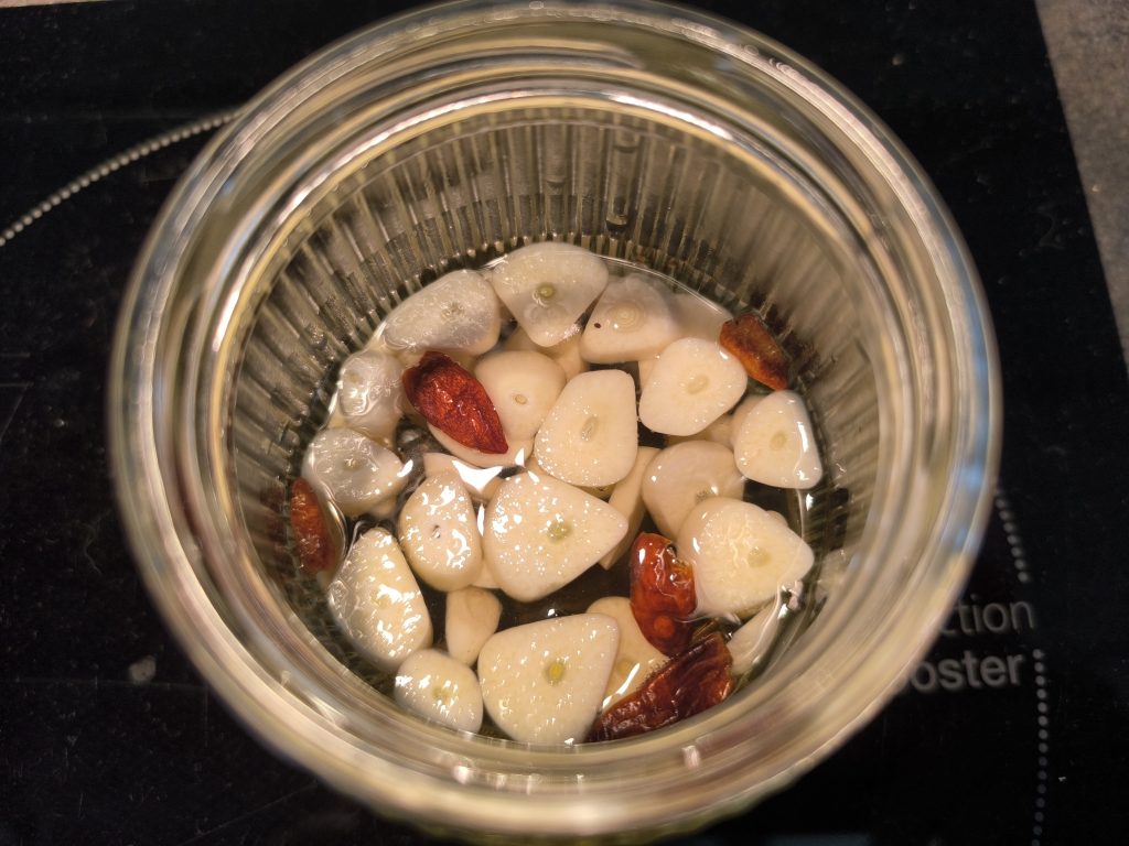 Krok 2 – obierz, a następnie pokrój czosnek w grube plasterki (albo przekrój na pół zależnie od preferencji). Wrzuć czosnek do słoiczka, wraz z papryczkami chilli.