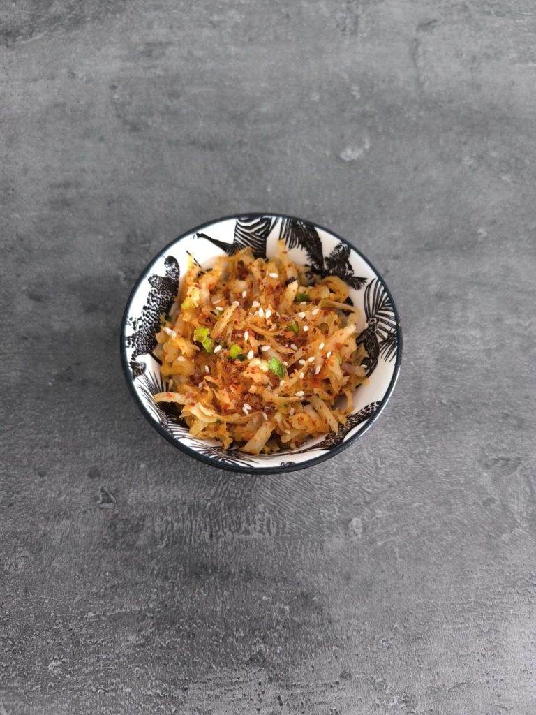 Musaengchae to jedna z najbardziej banalnych potraw kuchni koreańskiej – tym bardziej warto ją znać. Nieczęsto da się przyrządzić smaczną sałatkę z zaledwie jednego składnika (i paru przypraw). Więc jeśli macie w domu białą rzodkiew i nie macie na nią pomysłu – ta surówka to strzał w dziesiątkę!