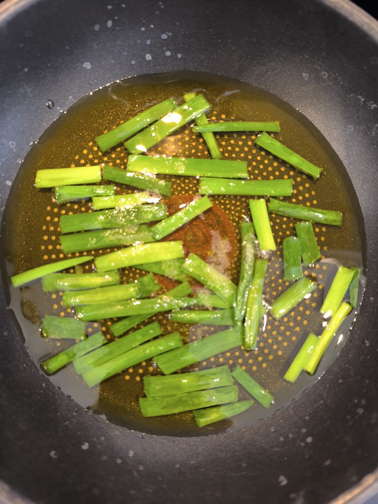 Szczypiorek podsmaża się w oleju w niskiej temperaturze, stopniowo wydobywając jego smak, ale nie zmieniająć jego koloru ani struktury.