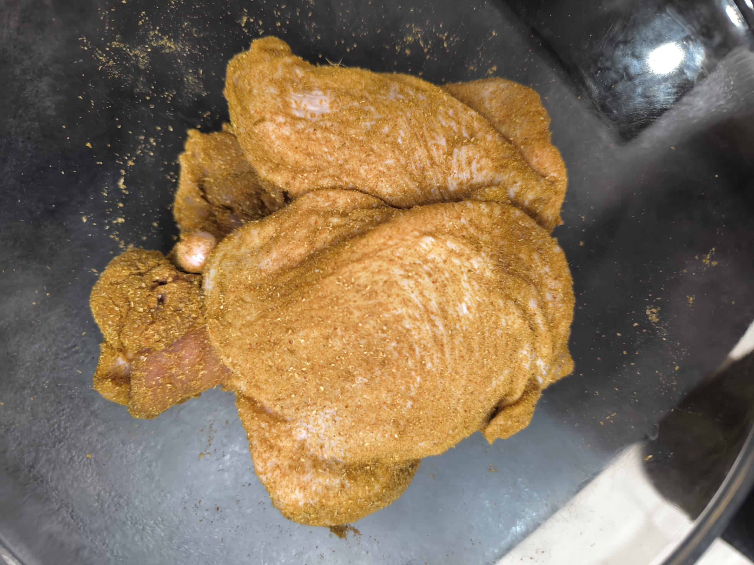 Upraż nasiona kolendry, kminu rzymskiego, gorczycą i suszonymi papryczkami chilli na suchej patelni, odczekaj, aż ostygną i je zmiel. Następnie wymieszaj z mielonym koprem włoskim, kozieradką, kashmiri chilli, kurkumą i solą. Obtocz udka kurczaka w przygotowanej mieszance i dokładnie wmasuj przyprawy w mięso; odstaw do lodówki na całą noc (albo przynajmniej na pół godziny).
