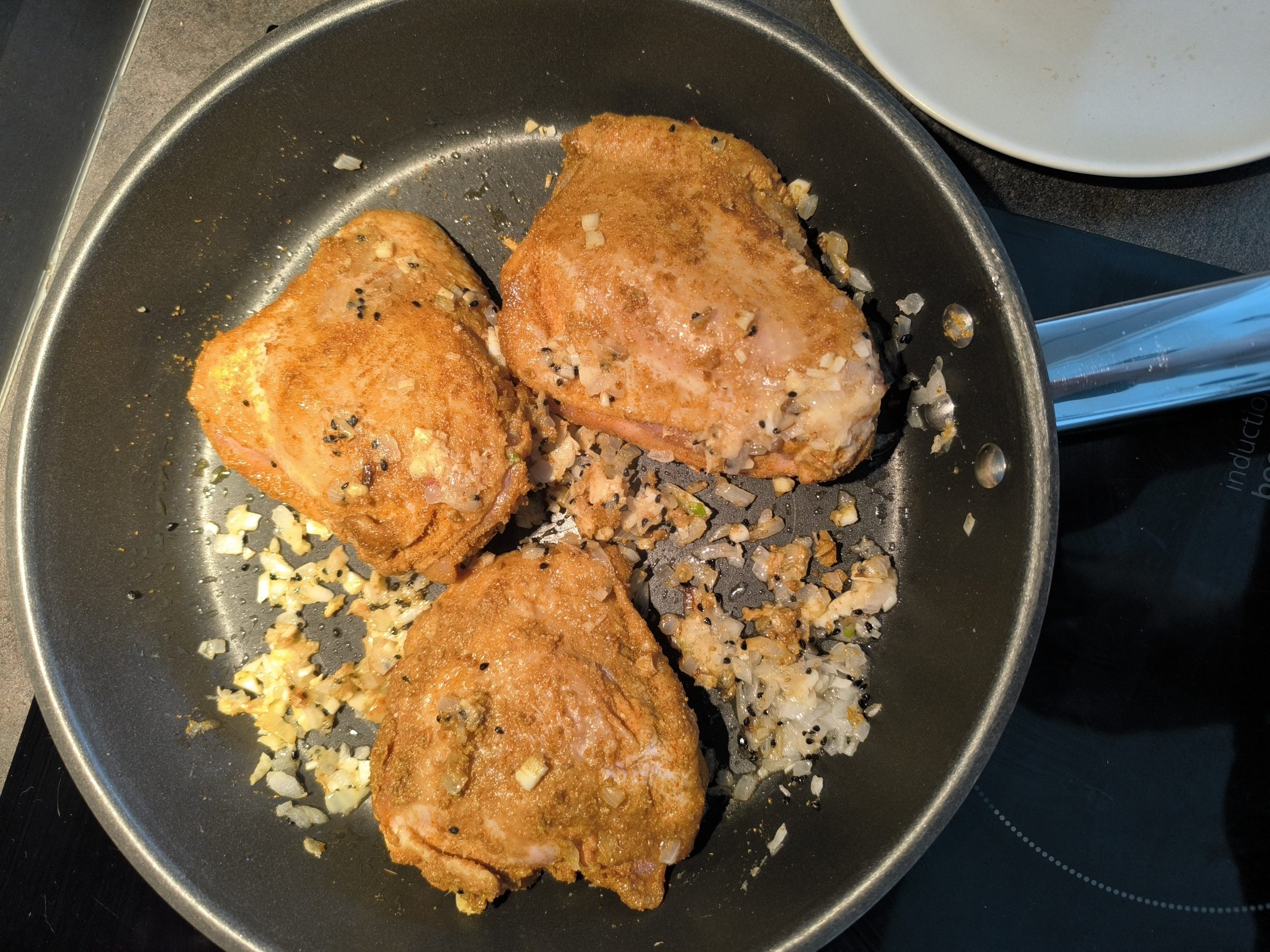 Rozgrzej na patelni olej i dodaj czarnuszkę, smażąc przez minutę, aż zacznie pachnieć. Dodaj cebulę i smaż 6–8 minut, aż lekko się przyrumieni. Dodaj czosnek i puree z imbiru, smaż kolejną minutę, aż stracą surowy aromat. Dołóż zamarynowane udka kurczaka wraz z przyprawami, które odpadły z marynaty, i obsmaż je z obu stron, aż masala lekko się przyrumieni i uwolni aromat.