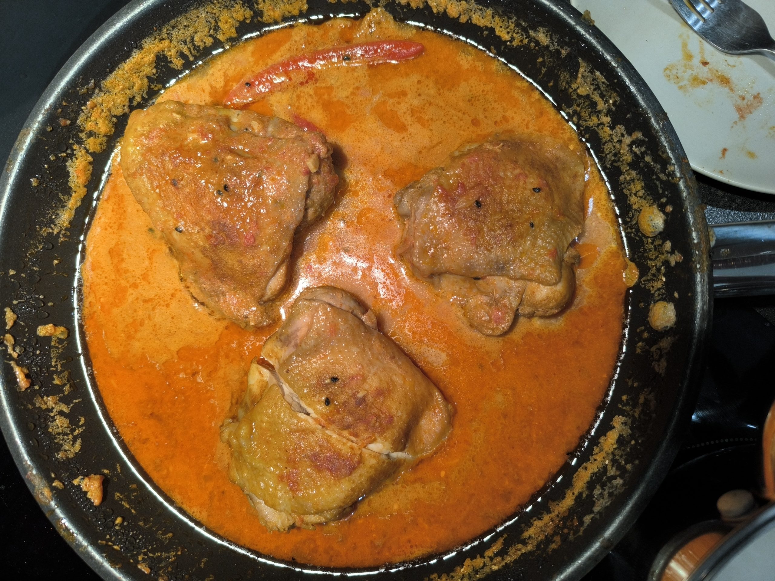 Dodaj puree pomidorowe, amchur, wodę, cukier oraz marynowane limonki i wymieszaj, aby sos stał się jednolity. Dodaj jogurt grecki i połącz z sosem, mieszając, aż całość będzie gładka. Przykryj patelnię i duś udka kurczaka 15 minut na średnio-niskim ogniu, po czym obróć mięso i gotuj kolejne 15 minut pod przykryciem, aż sos zgęstnieje, przyprawy się ułożą, a tłuszcz lekko oddzieli się na powierzchni; dopraw solą lub odrobiną cukru według potrzeby.