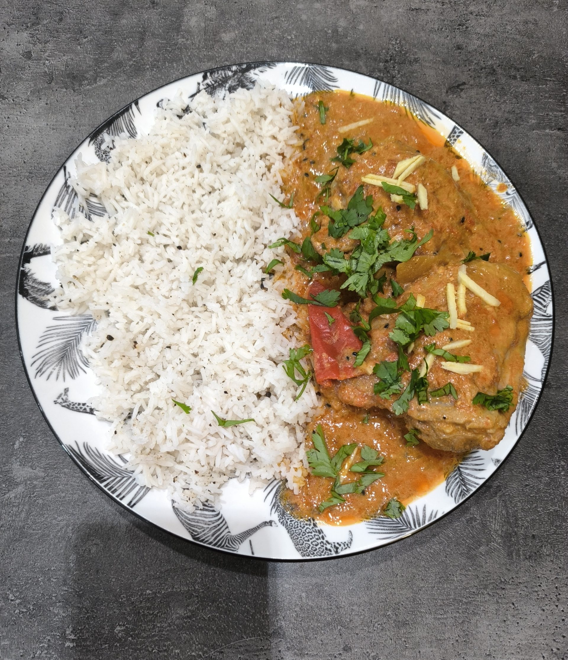 Achari curry najlepiej smakuje wtedy, gdy pozwolisz mu być tym, czym jest: daniem o wyrazistym, piklowym charakterze, które potrzebuje neutralnego towarzystwa. Najczęściej podaje się je z ryżem basmati, który łatwo zbiera sos i tonuje ostrość, albo z ciepłym naanem, dzięki któremu można „wyczyścić” talerz do ostatniej kropli. Na wierzch koniecznie dorzuć świeżą kolendrę oraz imbir pokrojony w cienkie słupki – te dwa dodatki nie są dekoracją, tylko integralną częścią dania. Kolendra rozjaśnia profil smakowy, a surowy imbir dodaje ostrego, lekko cytrusowego akcentu, który idealnie kontruje gęstość sosu. To talerz, który je się powoli, warstwa po warstwie, dokładnie tak jak został zbudowany.