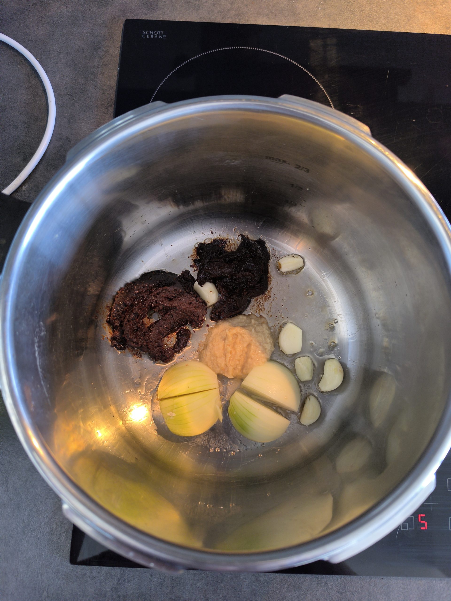 Do garnka wlej odrobinę oleju (może być nawet sezamowy) i chwilę podsmaż cebulę, czosnek, imbir, pastę doenjang.