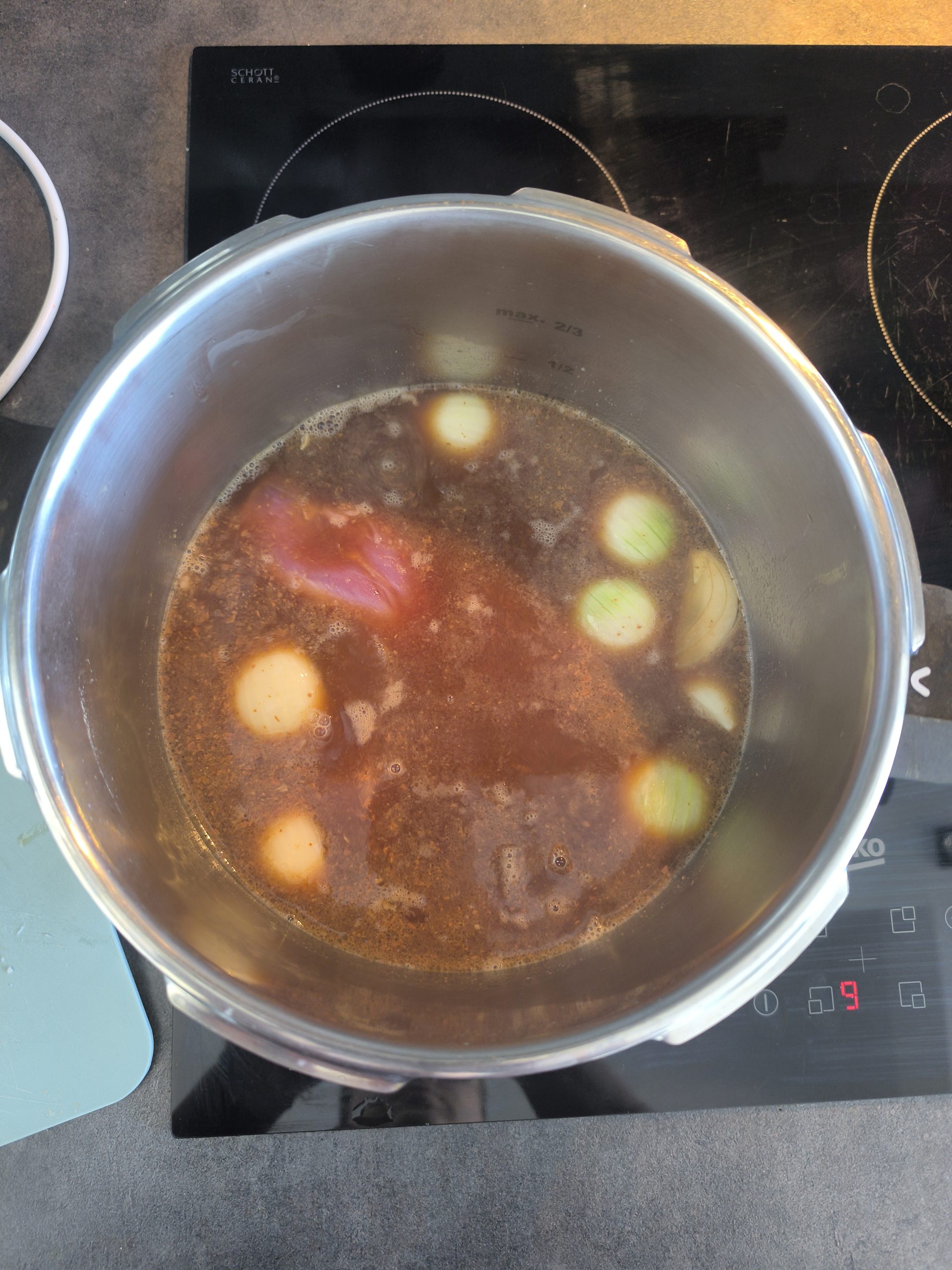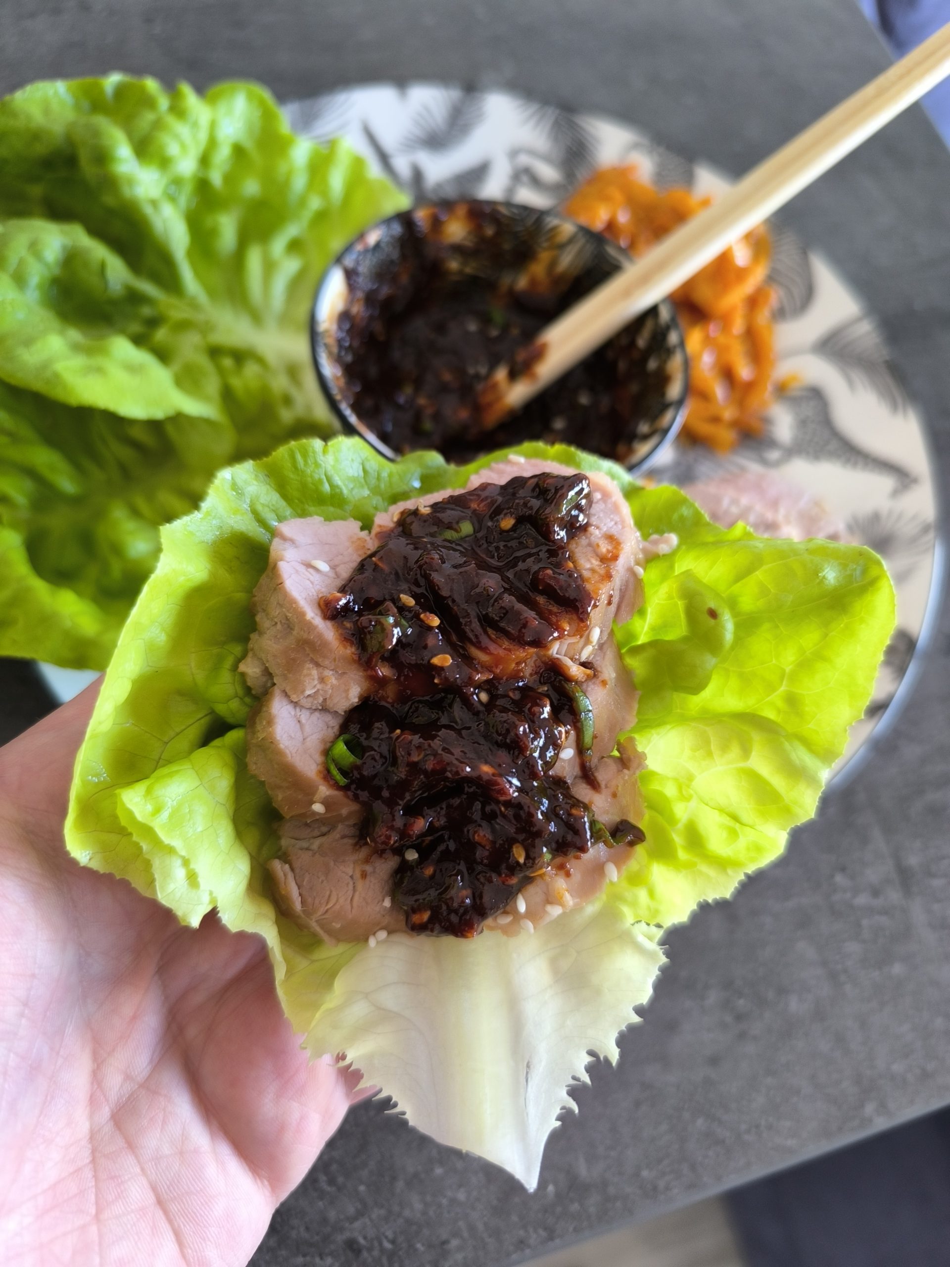 Efekt? Głęboki smak wypełniony umami oraz delikatne, różowawe mięso, które można podawać z prostym sosem do maczania albo zawijać w liście zblanszowanej kaputy lub po prostu sałaty.