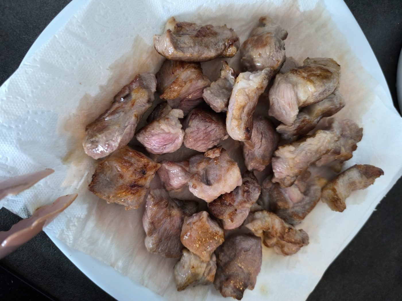 Rozgrzej wok na średnio-wysokim ogniu, dodaj olej i obsmażaj karkówkę partiami, aż każdy kawałek dobrze się zrumieni; w razie potrzeby dolewaj niewielką ilość oleju, aby mięso smażyło się, a nie dusiło. Usmażone kawałki odkładaj na ręcznik papierowy, aby pozbyć się nadmiaru tłuszczu.