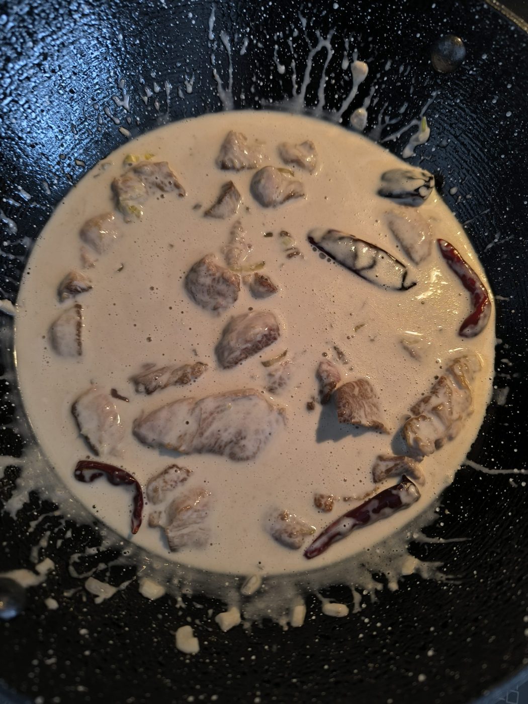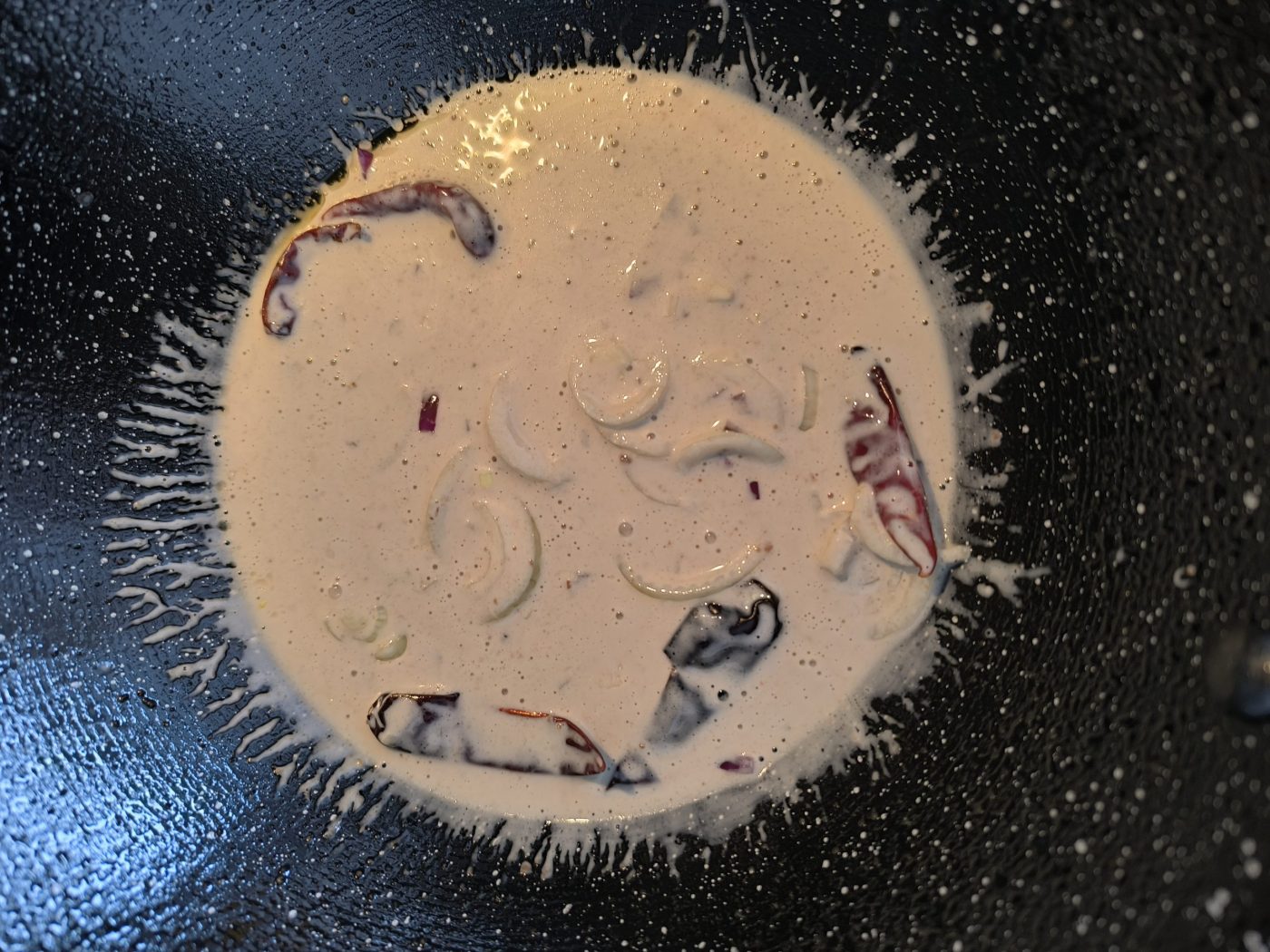 Do tego samego woka dodaj pastę krewetkową i smaż ją krótko na tłuszczu, aż zapach się lekko zmieni (moim zdaniem przestaje być tak nieprzyjemny), następnie dodaj suszone papryczki chilli i smaż całość około 2 minut, uważając, aby chilli się nie przypaliło. Wlej gęstą część mleka kokosowego i, gdy zacznie się rozwarstwiać, dodaj czosnek oraz oba rodzaje cebuli; smaż całość na średnim ogniu przez około 8 minut, aż aromaty się uwolnią, a zapach pasty krewetkowej wyraźnie złagodnieje.