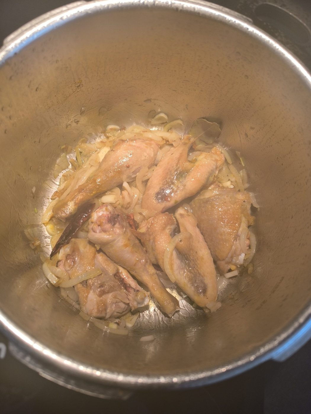 W szybkowarze lub głębokim garnku rozgrzej olej i obsmaż porcjami kawałki perliczki na dość mocnym ogniu, aż ładnie się zrumienią z każdej strony. Mięsa nie smaż do pełnej gotowości – chodzi wyłącznie o zbudowanie smaku. Usmażone kawałki przełóż na talerz.