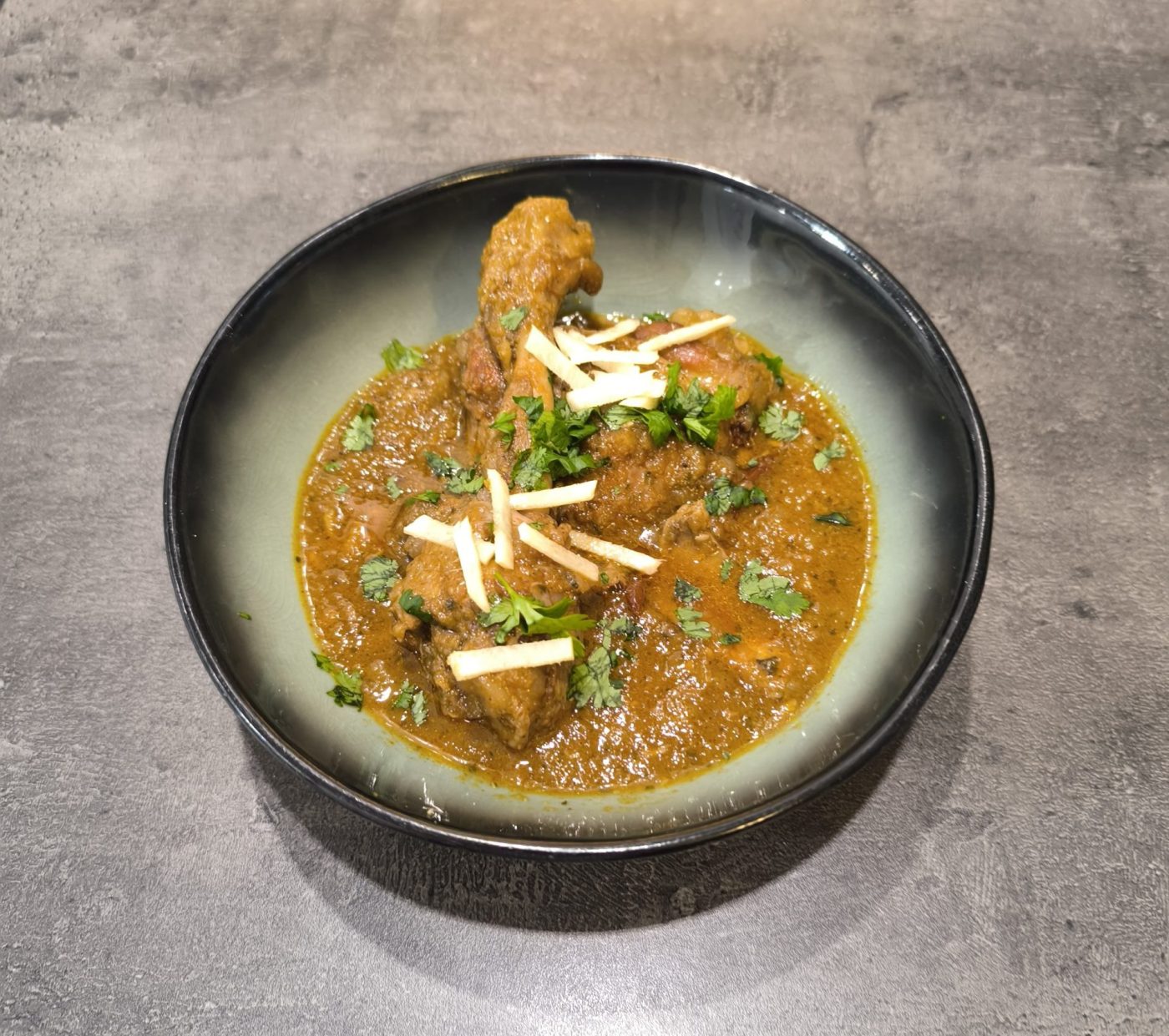 Chukar curry to danie intensywne nie tylko w smaku, ale też w strukturze. Sos nie jest kremowy ani aksamitny – jest gęsty, cebulowy, lekko oleisty i ciężki z wyraźnie zaznaczonymi przyprawami. To curry, którego smak długo siedzi na języku i feeria smaków zmienia się niczym w kalejdoskopie. Mięso zachowuje zwartą, dziką strukturę, daleką od miękkości znanej z curry restauracyjnych na bazie kurczaka, ale właśnie to stanowi o jego charakterze. Intensywność buduje się tu przez redukcję płynu, użycie tłuszczu i czas.