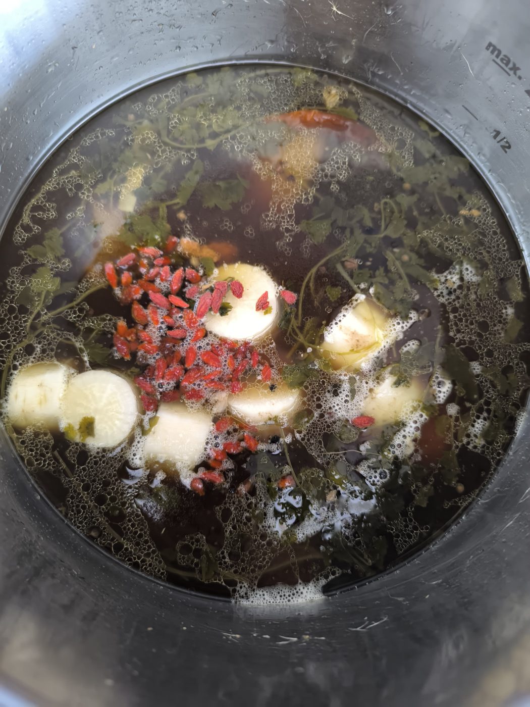 Dodaj jagody goji oraz rzodkiew i gotuj jeszcze 20–25 minut na małym ogniu. Spróbuj i skoryguj smak – zupa powinna być wytrawna, lekko słodkawa i wyraźnie słona, ale nie ciężka. W międzyczasie ugotuj makaron zgodnie z instrukcjami na opakowaniu (tylko go nie sól!).