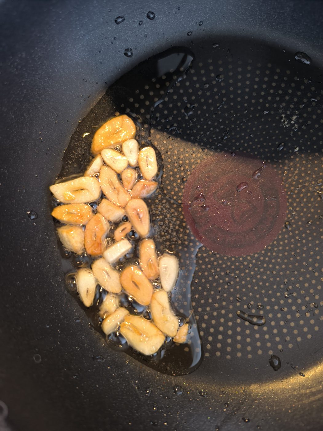 Guay Tiew Ped często podaje się z chrupiącym czosnkiem. To prosty element, który zmienia teksturę zupy. Cienkie plasterki czosnku smaży się na oleju lub kaczym tłuszzu do momentu, aż staną się złote i kruche. Po wystudzeniu zachowują chrupkość i można je posypać na wierzchu gotowej miski.