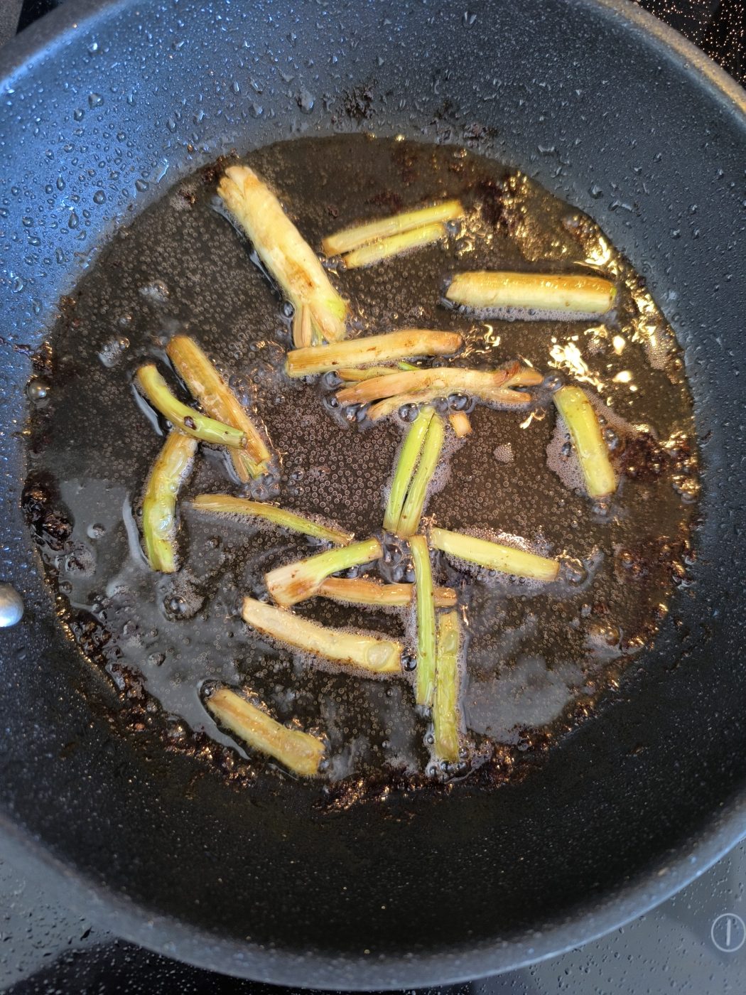 W tłuszczu wytopionym z kaczki podsmaż białą część szczypiorku na dość wysokiej mocy, mieszając, aż stanie się wyraźnie ciemna i lekko zwęglona. Nie doprowadzaj do goryczy. Dodaj ją do bulionu i gotuj razem przez około 5 minut.