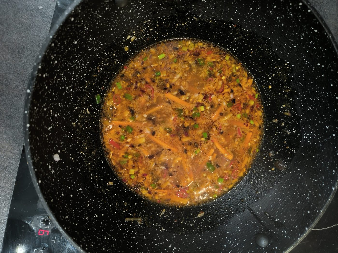 Na tym samym oleju dodaj czosnek, szalotkę i imbir, smażąc krótko, aż aromaty się uwolnią, ale nic nie zacznie się jeszcze rumienić. Dodaj wcześniej wymieszane składniki sosu i smaż całość chwilę, aby olej połączył się z chilli i przyprawami.