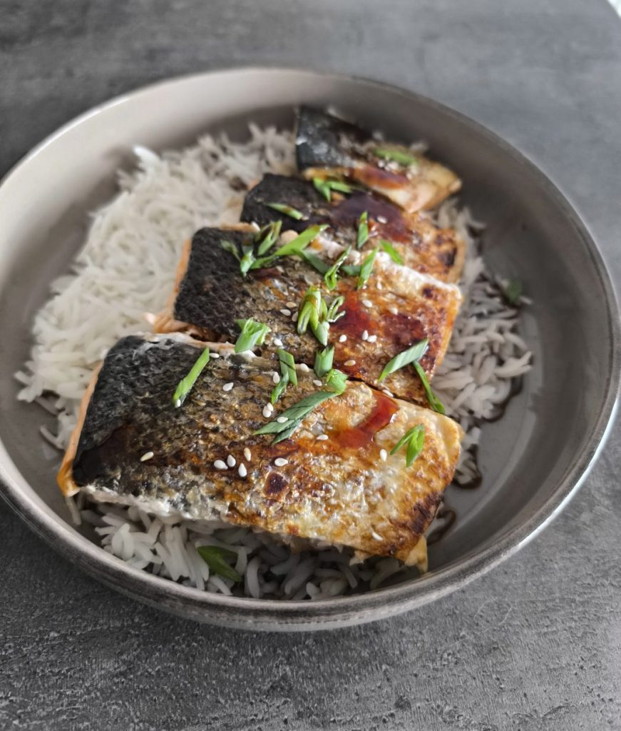 Podaj łososia na ugotowanym ryżu, układając go skórą do góry. Polej całość resztą sosu z patelni, posyp szczypiorkiem oraz sezamem albo shichimi togarashi. Na koniec możesz skropić rybę odrobiną soku z cytryny. Smacznego!