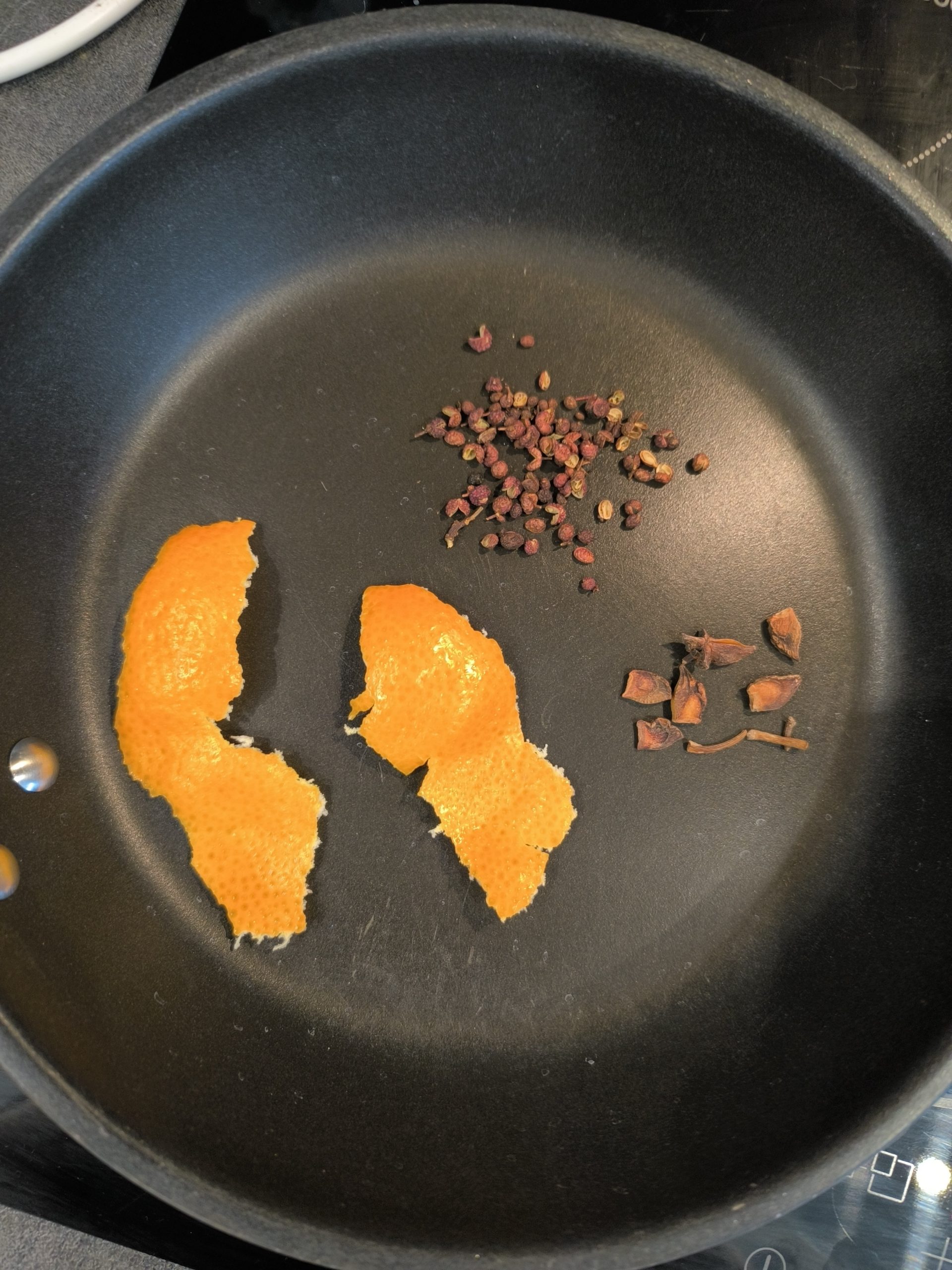 W międzyczasie na suchej patelni krótko przypraż pieprz syczuański, anyż gwiazdkowy oraz skórkę z mandarynki lub pomarańczy. Podgrzewaj je tylko do momentu, aż zaczną intensywnie pachnieć – nie powinny się przypalić. Odstaw na bok.