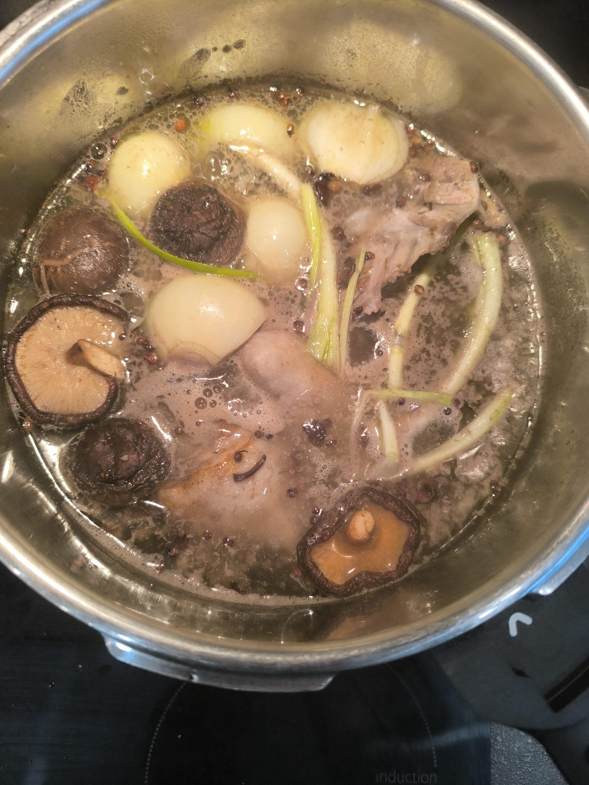 Do garnka lub szybkowaru włóż oczyszczoną kaczkę, przyprażone przyprawy, suszone grzyby shiitake, cebule, szczypiorek oraz sól. Wlej wodę (około 2–2.5 l) i dodaj wino Shaoxing. Zamknij szybkowar i gotuj przez 25 minut pod wysokim ciśnieniem. Po zakończeniu gotowania pozwól, aby ciśnienie zeszło naturalnie.