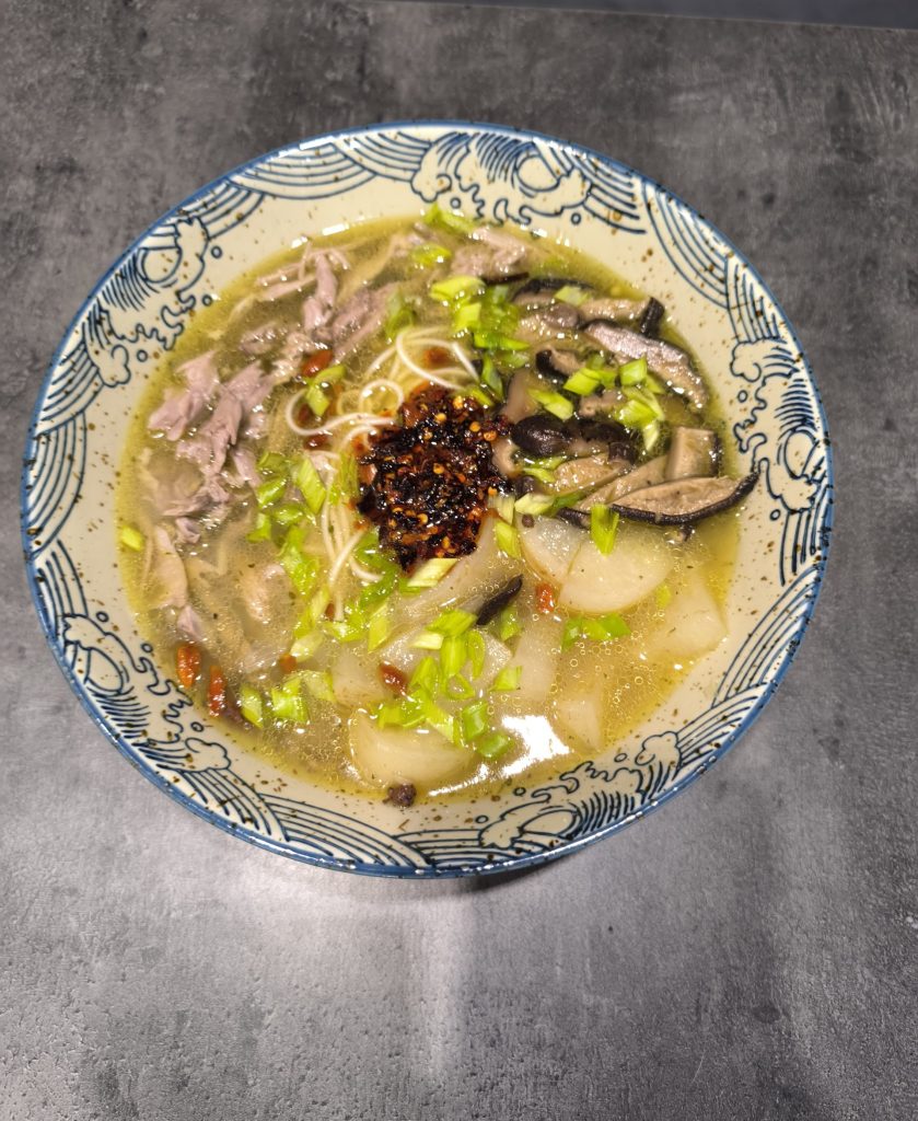Old Duck Soup (老鸭汤) to klasyczna południowochińska zupa "prozdrowotna", gotowana na korpusie kaczki, z dodatkiem białej rzodkwi, suszonych grzybów i aromatycznych przypraw. Tradycyjnie podawana jako klarowny wywar do picia, w tej wersji została świadomie wykorzystana jako baza do pełnoprawnego dania z makaronem. To kuchnia cierpliwa i techniczna — oparta na oczyszczeniu wywaru, kontroli tłuszczu i budowaniu głębi smaku bez sosów czy zagęszczaczy.
