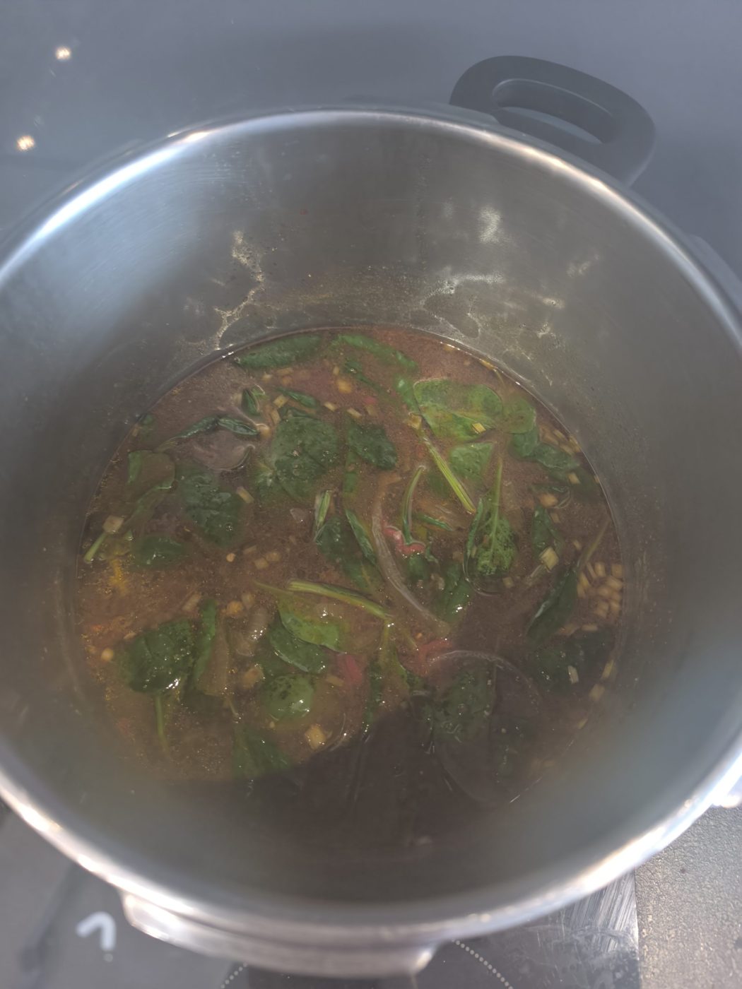 Do garnka z zupą dodaj 2 łyżki proszku pachnotki (perilla), sos rybny oraz sos śliwkowy. Gotuj na małym ogniu około 10 minut, mieszając, aby perilla dobrze się rozprowadziła i zagęściła zupę. Następnie dodaj do zupy białą część szczypiorku. Dodaj ostatnią łyżkę perilli, dokładnie wymieszaj i spróbuj i dopraw wedle uznania. Na samym końcu dodaj garść szpinaku. Po około 30 sekundach, gdy szpinak zwiędnie, wyłącz palnik.