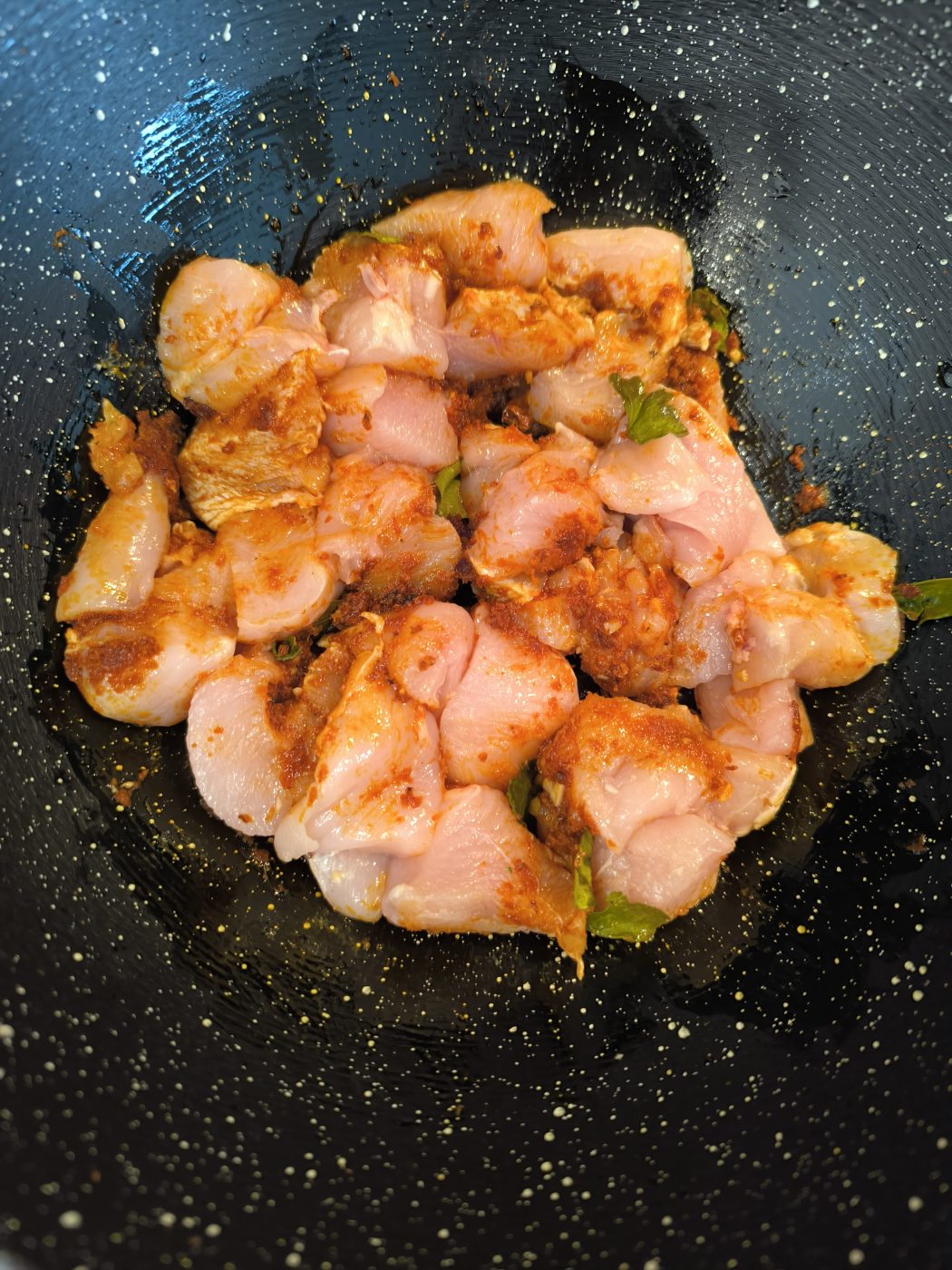 Dodaj czosnek i smaż przez około 1 minutę, tylko do uwolnienia aromatu. Następnie wrzuć kurczaka i w razie potrzeby dolej odrobinę oleju. Zwiększ ogień do średnio-wysokiego (moc 6 w indukcji) i smaż kurczaka, regularnie mieszając, aby miał szansę lekko się przyrumienić zanim zacznie puszczać sok. Dodaj liście kaffiru i dokładnie wymieszaj mięso z pastą curry.