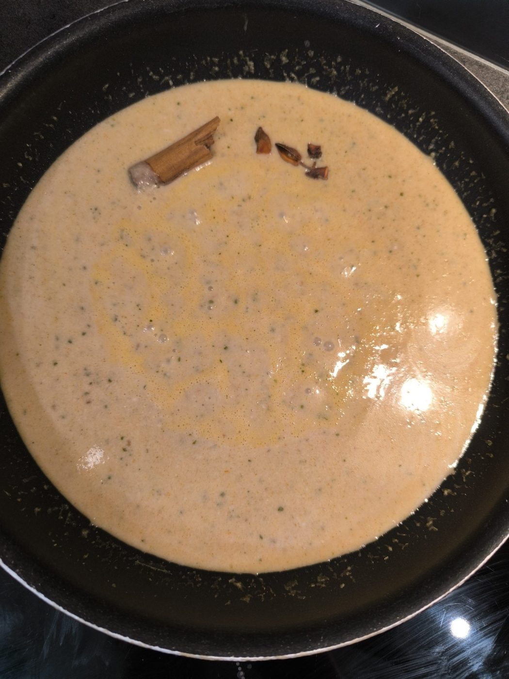 Otwórz puszkę mleczka kokosowego i oddziel gęstą część z góry. Rozgrzej patelnię lub wok i dodaj gęstą część mleczka kokosowego, podgrzewając ją aż zacznie się lekko rozdzielać i „smażyć” (to normalne i pożądane). Dodaj pastę Panang, anyż gwiazdkowy oraz laskę cynamonu i smaż całość około 10 minut, często mieszając, żeby pasta straciła surowość i oddała aromat do tłuszczu kokosowego. Następnie wlej resztę mleczka kokosowego z puszki, wymieszaj i gotuj kolejne 10 minut na umiarkowanym ogniu, regularnie mieszając; na koniec spróbuj i upewnij się, że sos jest wystarczająco słony. W międzyczasie możesz zająć się kaczką, by wszystko było gotowe w zbliżonym czasie.