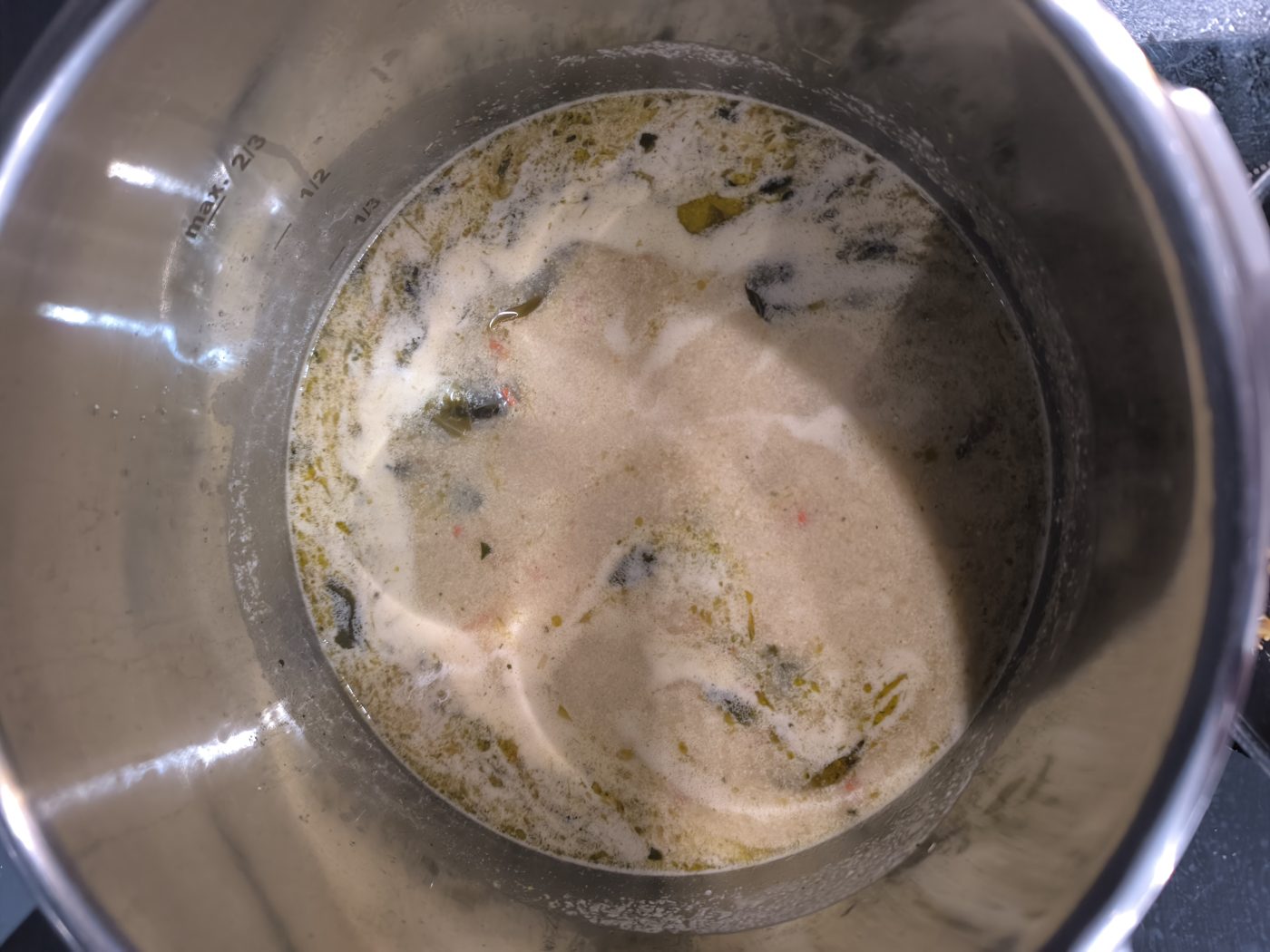 Z puszki mleka kokosowego zbierz gęstą część i przełóż ją do garnka lub szybkowaru. Podgrzewaj na średniej mocy, aż tłuszcz zacznie się oddzielać. Dodaj pastę aromatyczną i smaż ją około 8 minut, regularnie mieszając, aż stanie się bardzo intensywna i aromatyczna.
