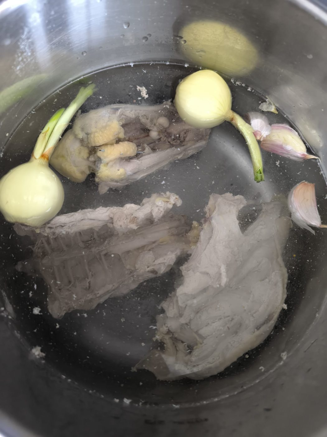 Przełóż korpus perliczki (przekrojony na 2–3 części) do garnka lub szybkowaru, dodaj cebule, czosnek oraz imbir, następnie zalej wszystko zimną wodą. Na tym etapie nie dodawaj soli ani żadnych przypraw, chyba że planujesz ściągnąć mięso z porcji rosołowej, wtedy polecam dać łyżeczkę soli już teraz. Jeżeli chcesz zrobić więcej bulionu, by użyć go do innego dania (ja tak zrobiłem), to daj 2 litry wody, ale wtedy koniecznie użyj szybkowaru.