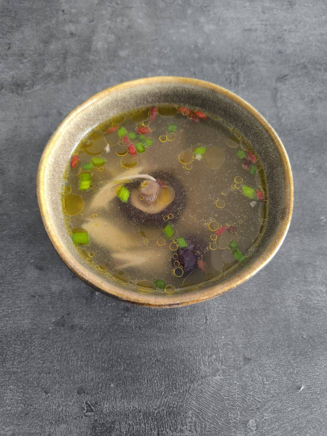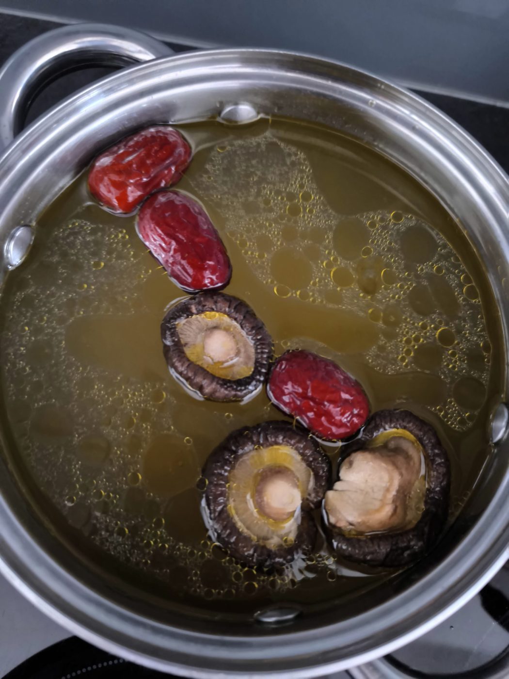 Gotuj bardzo łagodnie: w zwykłym garnku na minimalnym ogniu przez około 1,5–2 godziny, tak aby zupa tylko lekko „mrugała”, albo w szybkowarze przez 20–25 minut pod ciśnieniem, po czym pozwól, aby ciśnienie zeszło naturalnie. Jeśli na początku pojawi się piana, zbierz ją, a następnie pozostaw zupę w spokoju do końca gotowania. Jeśli najpierw potrzebowałeś/aś zrobić więcej bulionu - teraz jest idealny moment na odlanie części, zdjęcia mięsa z kości i odcedzenie bulionu oraz dodanie shiitake i jujube. Gdy dodasz te składniki to gotuj wywar na lekkim ogniu pod przykryciem przez około 30 minut.