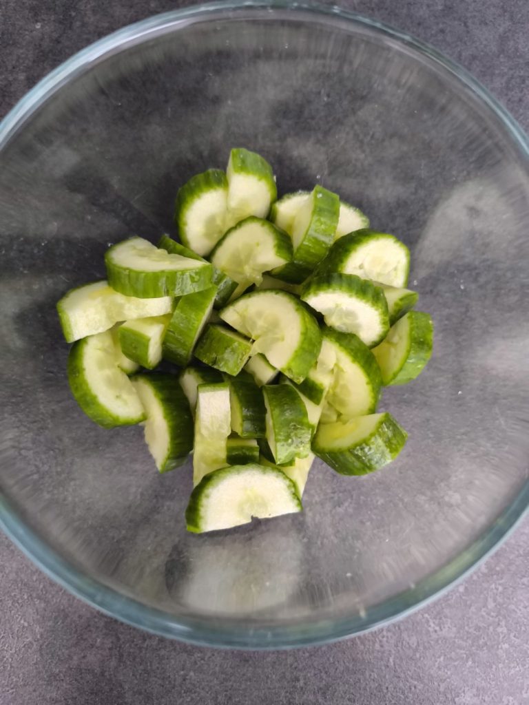 Krok 2: Następnie pokrój ogórka w grube półplasterki. Posól go (około pół łyżeczki soli), wymieszaj i odstaw na około 20 minut. W tym czasie ogórek puści część wody.